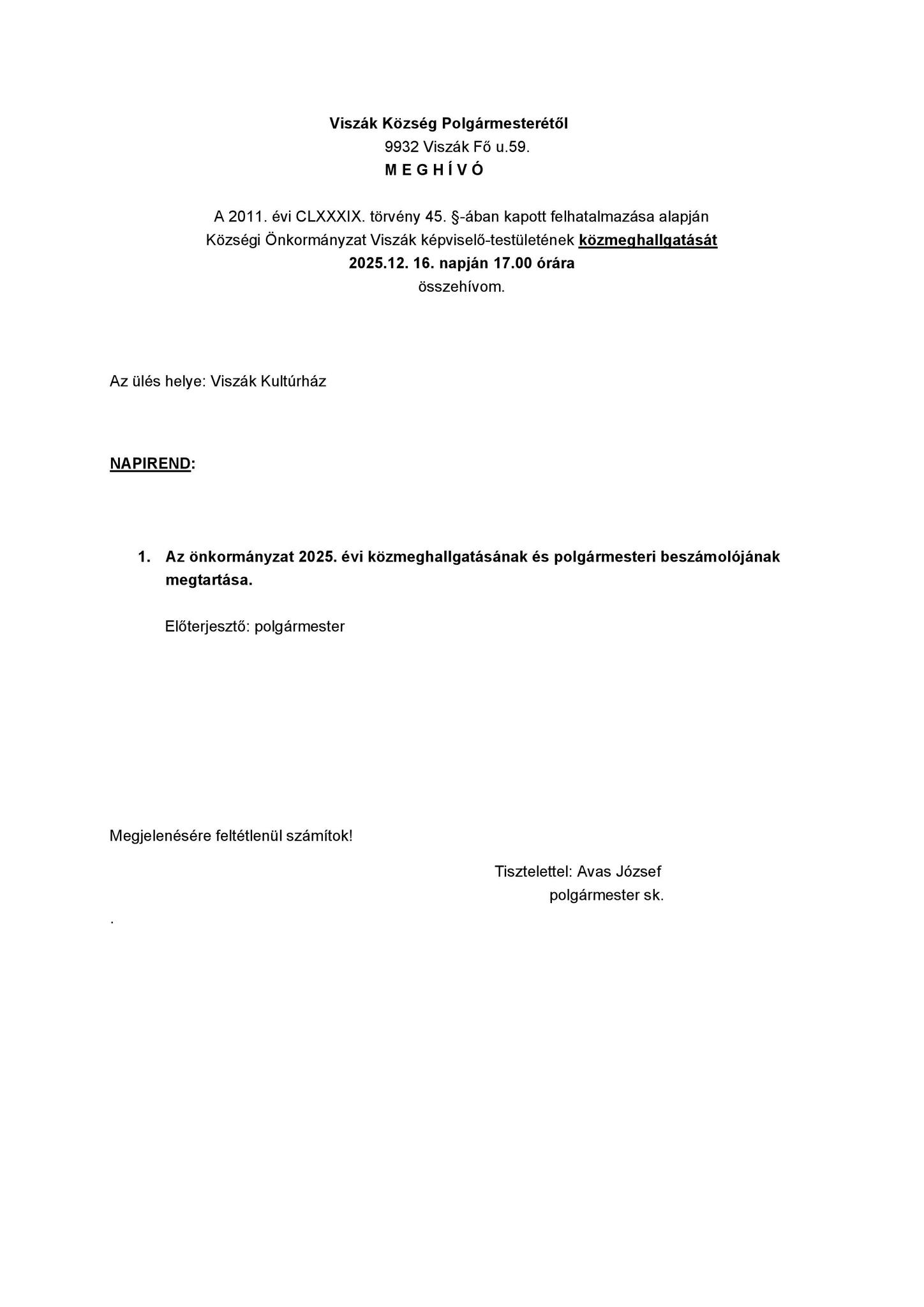 Az önkormányzat 2025. évi közmeghallgatásának és polgármesteri beszámolójának megtartása.